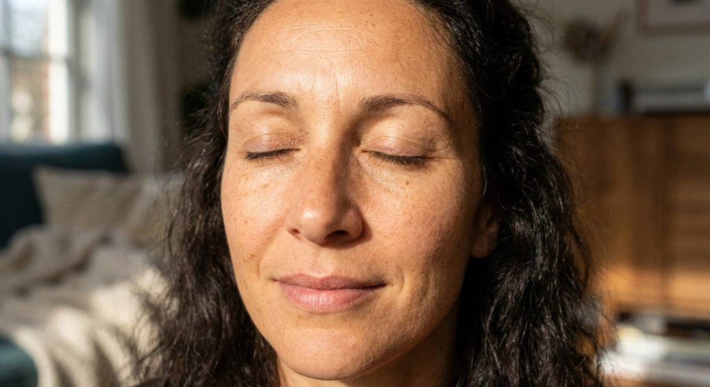 Một người phụ nữ đang tự tin mỉm cười, tay đặt nhẹ lên ngực, biểu lộ sự hài lòng và tự chủ về cơ thể mình.