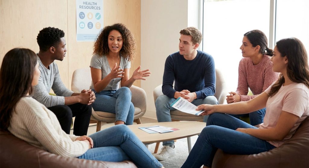 Hình ảnh minh họa các nhóm người trẻ tuổi đang thảo luận sôi nổi về sức khỏe sinh sản tại một buổi workshop.