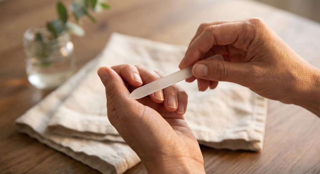 Sau khi cắt, các cạnh móng tay có thể còn hơi sắc. Sử dụng dũa móng để làm mịn các cạnh này. Dũa theo một hướng duy nhất để tránh làm mỏng móng tay. Hãy đảm bảo rằng không còn bất kỳ cạnh sắc nào có thể gây tổn thương.