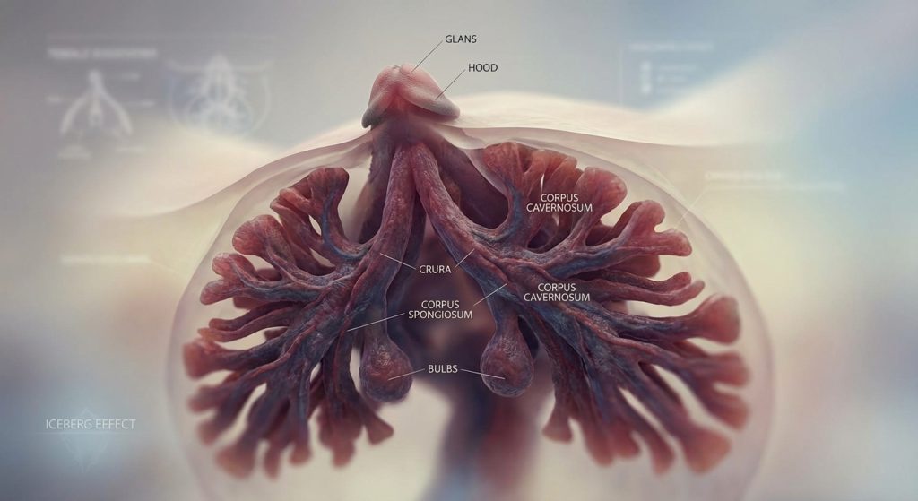 Phần mà chúng ta thường gọi là “đầu âm vật” hay “quy đầu âm vật” chỉ là đỉnh của một cấu trúc lớn hơn nhiều. Cụ thể, toàn bộ cơ quan âm vật bao gồm nhiều phần khác nhau, phần lớn trong số đó nằm bên trong khung xương chậu, ẩn mình khỏi tầm mắt. Đây là một điều khá bất ngờ đối với nhiều người, bởi lẽ chúng ta thường mặc định rằng mọi thứ liên quan đến bộ phận sinh dục đều nằm ở bề mặt.