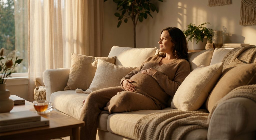 Người mẹ mang thai đang nhẹ nhàng xoa bụng, tìm kiếm sự thoải mái trên chiếc ghế sofa.