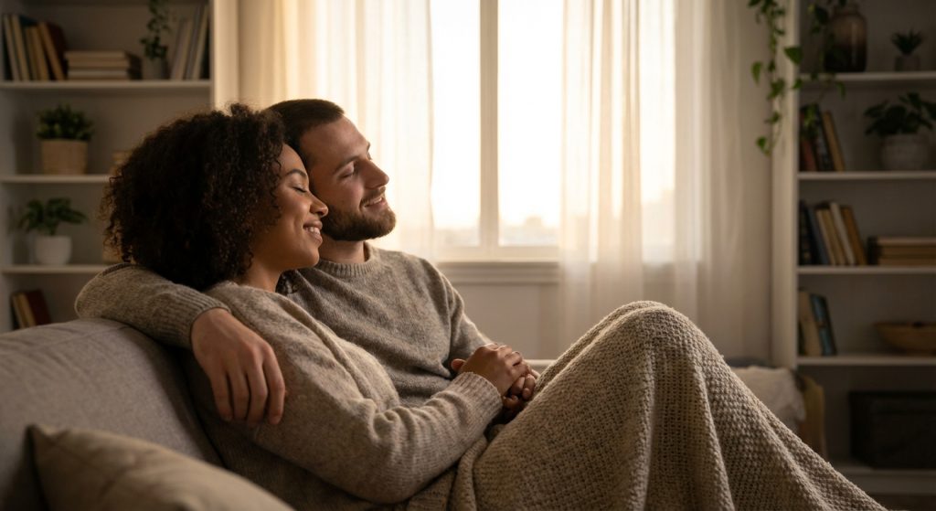 Tìm một tư thế thoải mái. Có thể là ôm nhau thật chặt, hoặc nằm cạnh nhau. Cảm nhận hơi ấm và nhịp thở của đối phương. Sự hiện diện đơn thuần này đã đủ để nuôi dưỡng Oxytocin.