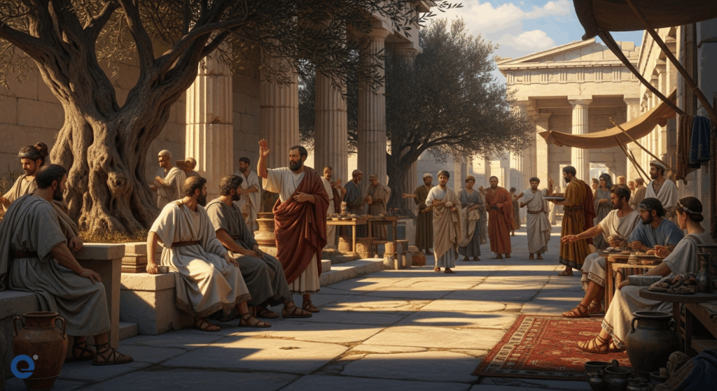 Socrates, một trong những triết gia vĩ đại nhất, đã dành nhiều thời gian ở Agora. Ông thường xuyên đặt câu hỏi và thách thức suy nghĩ của mọi người. Phương pháp đối thoại Socrates đã trở thành nền tảng cho triết học phương Tây. Ông đã bị kết án tử hình tại Athens. Lời kết tội của ông đã vang vọng qua nhiều thế kỷ.
