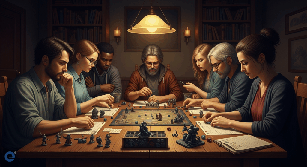 Một nhóm người đang ngồi quanh bàn, ánh mắt họ tập trung vào trung tâm, biểu tượng cho sự tương tác và suy luận trong một trò chơi chiến thuật.