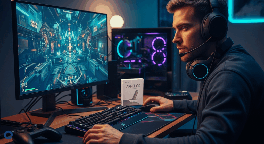 Một game thủ trẻ tuổi, đeo tai nghe và tập trung cao độ vào màn hình máy tính, bên cạnh là một chiếc hộp bao cao su “Aphelios” đặt gọn gàng trên bàn làm việc.