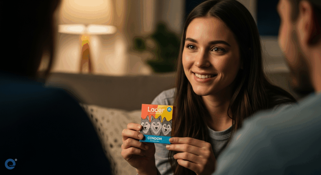 Một người phụ nữ trẻ mỉm cười nhẹ nhàng, tay cầm một chiếc hộp bao cao su nhỏ nhắn có in hình ba chú sói hoạt hình ngộ nghĩnh, đang trò chuyện thân mật với bạn bè trong không gian ấm cúng.