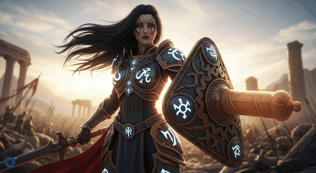Một nữ chiến binh mạnh mẽ, tóc đen dài, mặc giáp trụ cách điệu, tay cầm một chiếc bao cao su được thiết kế tinh xảo như một lá chắn, đứng trên nền cảnh quan hùng vĩ mang hơi hướng chiến trường cổ đại.