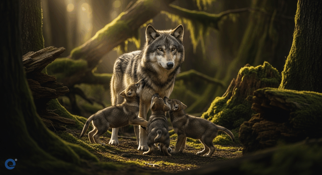 Một bầy sói con quây quần bên cạnh một con sói đầu đàn to lớn, thể hiện sự che chở và bảo vệ vững chắc trong một khu rừng rậm rạp.