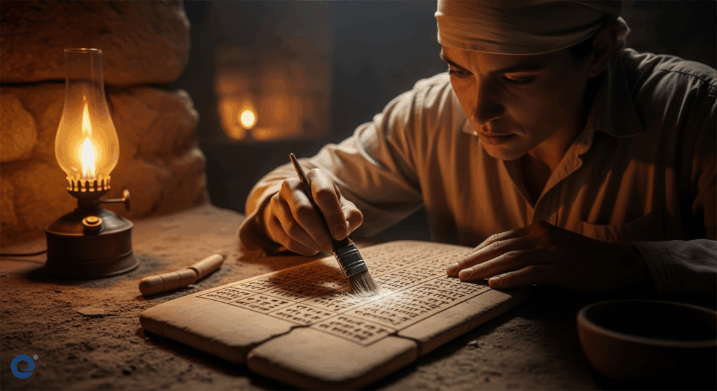 Một nhà khảo cổ học cẩn thận làm sạch một bảng đất sét cổ xưa, ánh sáng yếu chiếu vào các ký hiệu mờ nhạt, gợi lên sự bí ẩn của quá khứ.