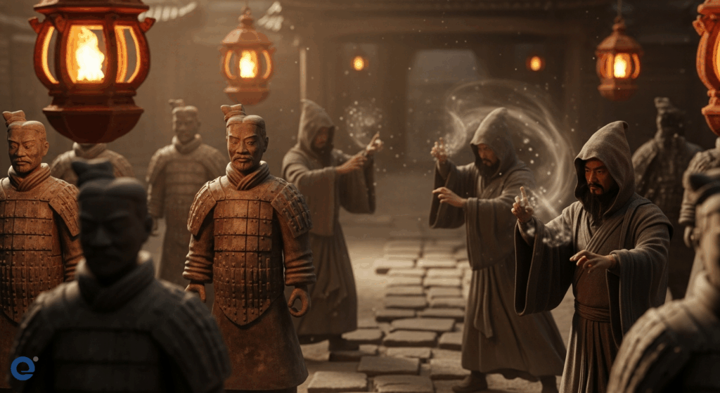 Bên cạnh quân đội đất nung hùng mạnh, lịch sử còn ghi nhận vai trò của các thuật sĩ triều đình. Họ là những người nắm giữ tri thức về thiên văn, địa lý, và cả những nghi lễ bí ẩn. Trong nhiều triều đại, thuật sĩ thường được giao phó nhiệm vụ cầu an, trừ tà, hoặc đưa ra lời khuyên dựa trên các phương pháp chiêm tinh. Do đó, hình ảnh thuật sĩ triều đình thì thầm trong bóng tối, có lẽ đang thực hiện một nghi lễ nào đó, không hề xa lạ.