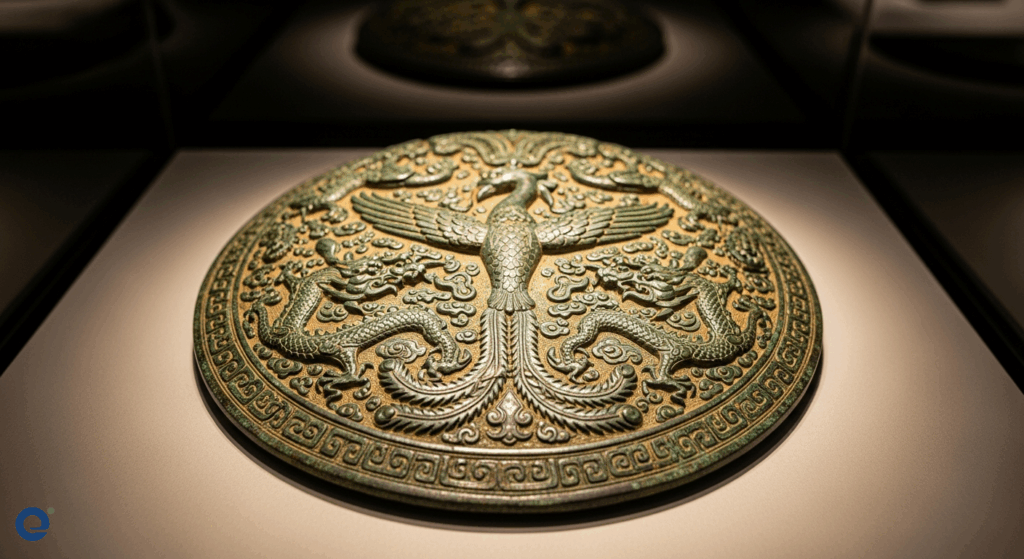 Một chiếc gương đồng thời Hán cổ được trưng bày trong bảo tàng, với hoa văn rồng và phượng tinh xảo nổi bật trên bề mặt kim loại đã ngả màu thời gian.