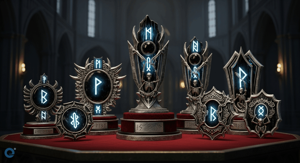 - Huy hiệu/Cúp độc đáo: Tìm kiếm hoặc tự thiết kế những chiếc cúp, huy hiệu có hình ảnh ma mị, bí ẩn như đầu lâu, con quạ, móng vuốt sói…