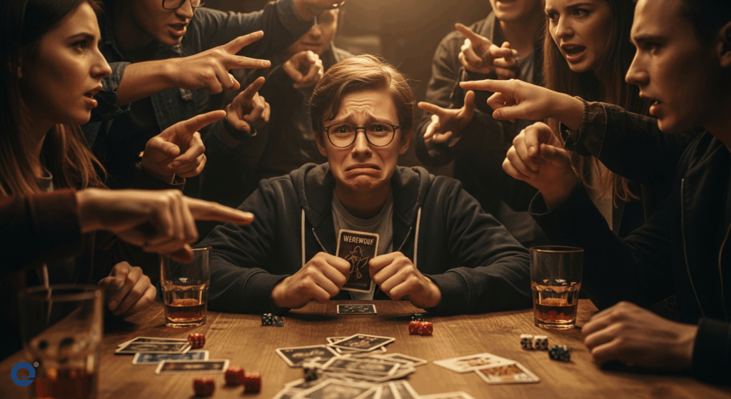 Một người chơi trẻ tuổi, đeo kính, đang ngồi giữa một nhóm người chơi khác với vẻ mặt bối rối, tay cầm lá bài Ma Sói, trong khi những người xung quanh đang sôi nổi tranh luận.