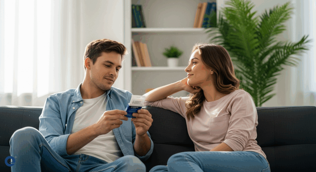 Hai người trẻ ngồi đối diện nhau trên ghế sofa, một người đang cầm một hộp bao cao su, còn người kia đang mỉm cười và gật đầu, thể hiện sự đồng thuận và thoải mái trong cuộc trò chuyện.