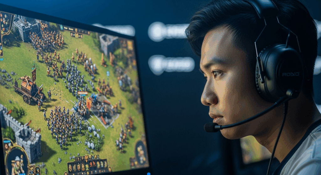 Một hình ảnh Chim Sẻ Đi Nắng đang tập trung cao độ trong một trận đấu Age of Empires căng thẳng, với màn hình máy tính rực sáng và biểu cảm quyết tâm trên khuôn mặt.