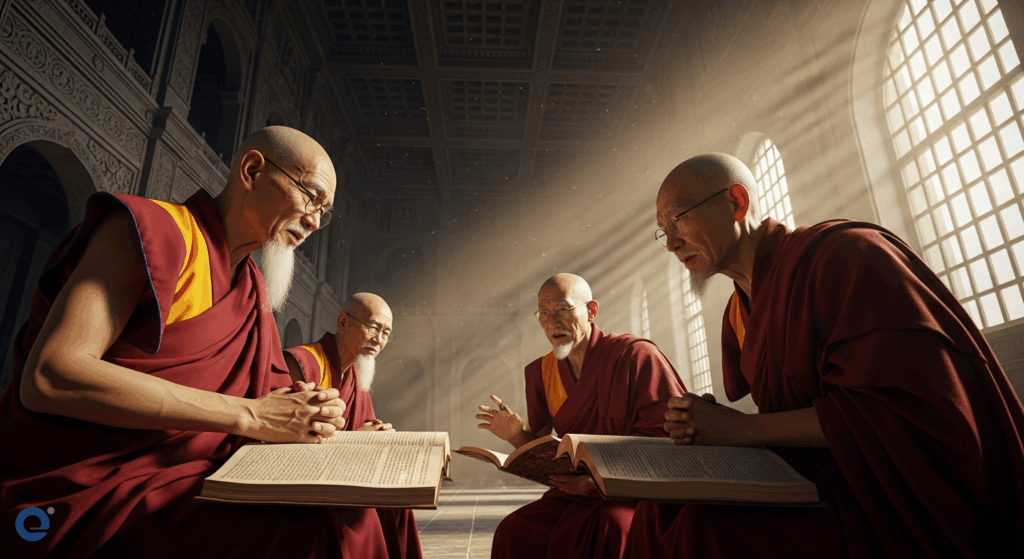 Các nhà sư uyên bác, tay cầm kinh sách, đang say sưa tranh luận trong một hội trường cổ kính, ánh sáng vàng dịu hắt qua cửa sổ lớn.