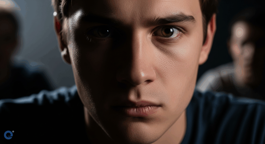Một người chơi Ma Sói đang cố gắng giữ vẻ mặt bình thản, nhưng ánh mắt lại hé lộ sự căng thẳng khi quan sát những người xung quanh.