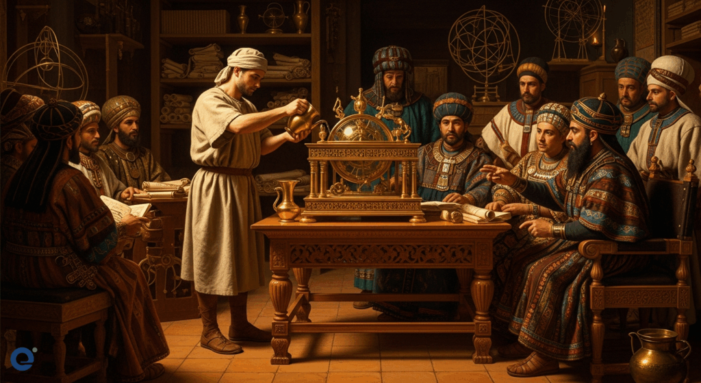 Một người phục vụ cẩn thận đổ đầy nước vào chiếc bình đồng hồ nước bằng đồng thau, trong khi các quan chức Babylon khác đang thảo luận về thời gian.