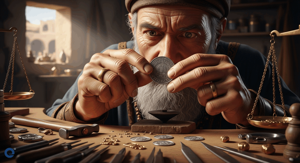 Một người thợ kim hoàn thời cổ đại cẩn thận kiểm tra một đồng shekel bạc, ánh mắt tập trung vào các chi tiết nhỏ trên bề mặt.