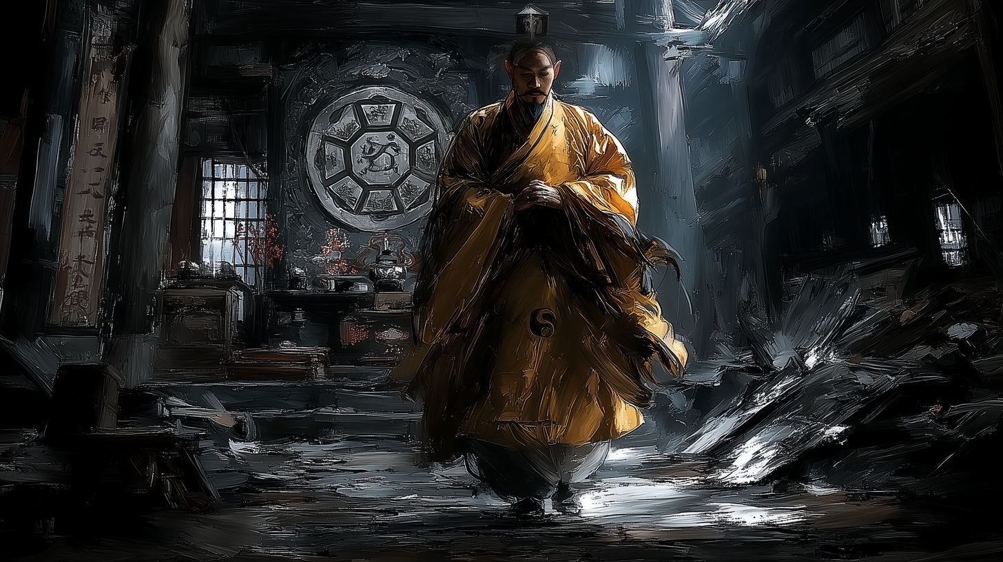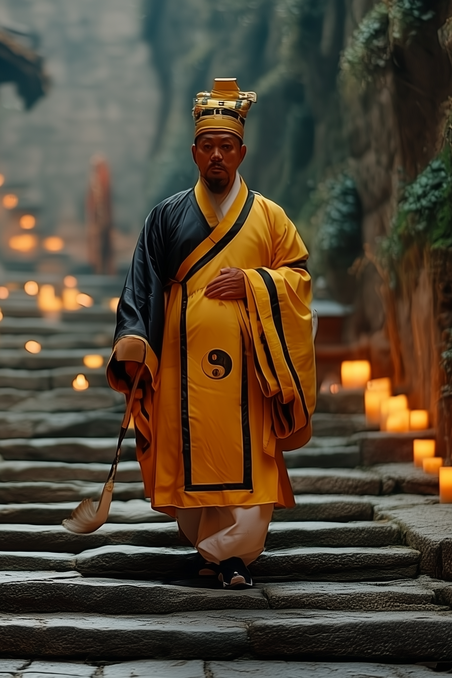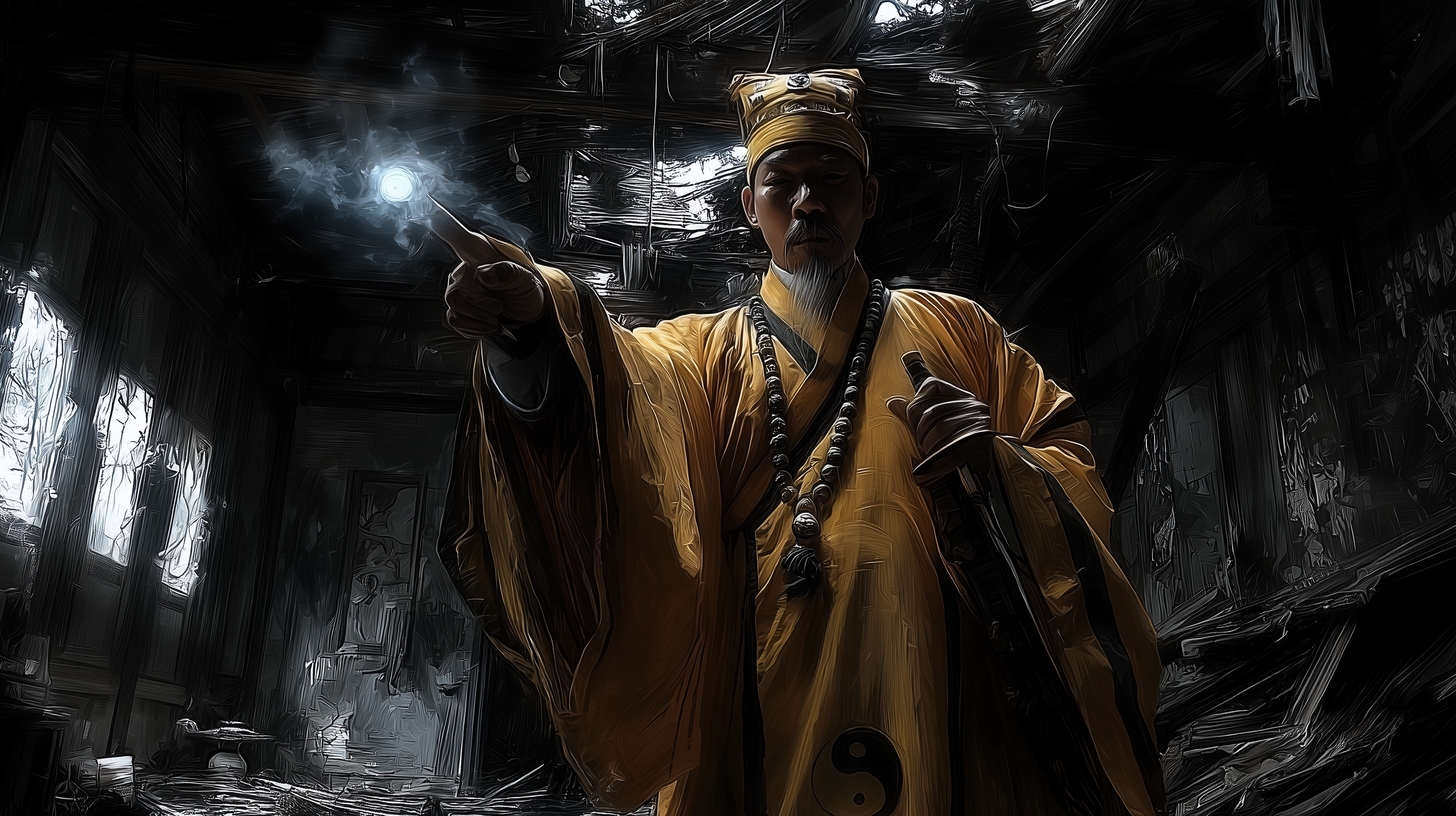 Một đạo sĩ lạ lùng đến từ phương xa, nghe danh đại sư trên ngôi đền cổ nên tới xin đàm đạo, trao đổi kiến thức nhưng không có duyên gặp gỡ. Trong thời gian đó, ông chu du quanh khu vực đó giúp người dân về phong thủy, trấn nhà, trấn mộ, giải trùng tang; xua đuổi tà ma quấy nhiễu. Hành trang mang theo bên hông có hồ lô và thanh kiếm gỗ đào, chuông mõ, thanh la trong tay nải.