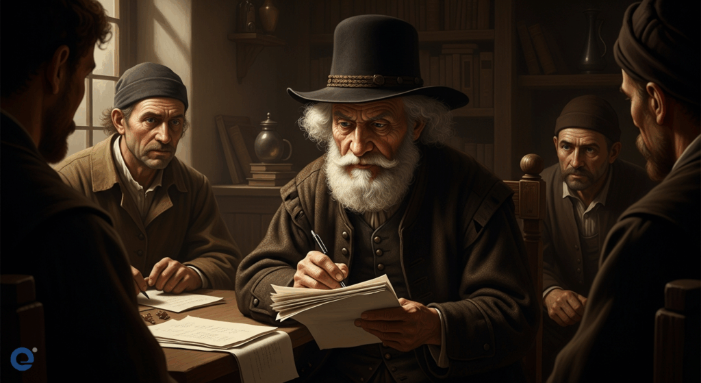 Một già làng uyên bác, với ánh mắt sắc sảo, đang lắng nghe lời khai của các người chơi trong một căn phòng tối, tay cầm một tập giấy ghi chép.