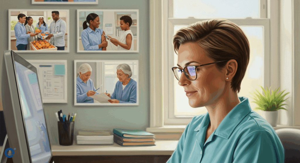 Một nhân viên xã hội đang cẩn thận nhập thông tin vào một hệ thống máy tính, với hình ảnh những gia đình đang nhận hỗ trợ ở phía sau.