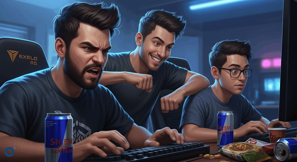 Một nhóm game thủ LMHT, mỗi người mang một biểu cảm khác nhau: người nghiêm túc ra lệnh, người cười đùa nghịch ngợm, và người còn lại lặng lẽ tập trung vào màn hình.