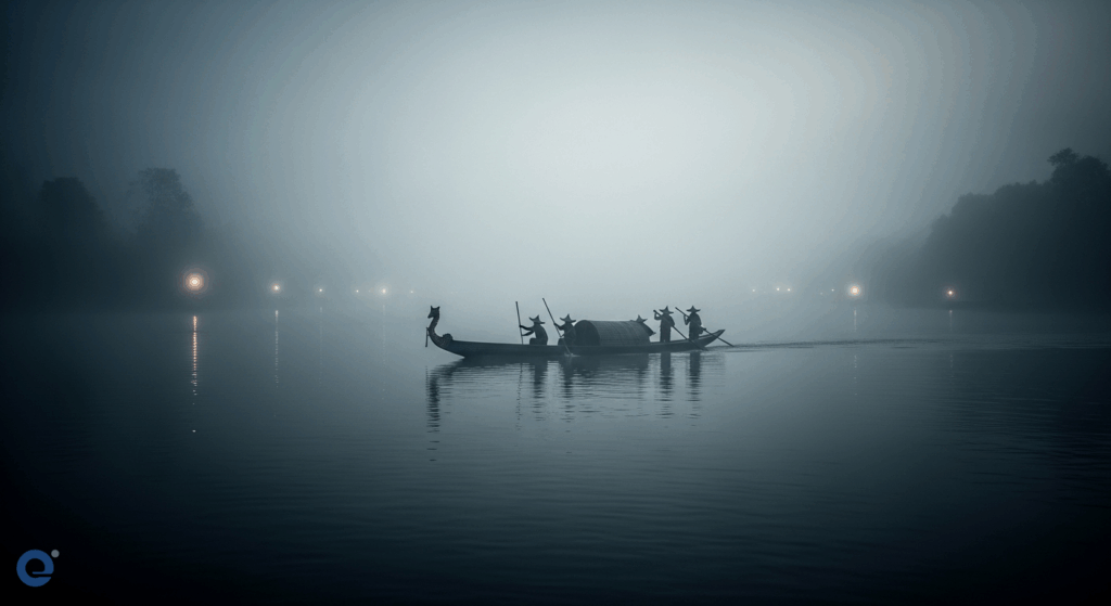 Khung cảnh Tràng An về đêm mang một vẻ đẹp siêu thực. Sương lạnh giăng mờ, bao phủ lấy những ngọn núi đá vôi hùng vĩ. Dòng sông uốn lượn như dải lụa mềm mại dưới ánh trăng. Tiếng mái chèo khua nhẹ trên mặt nước là âm thanh duy nhất phá tan sự tĩnh mịch. Những người trên thuyền, dù là ngư phủ dày dạn kinh nghiệm, người lính canh gác đồn, hay nho sinh uyên bác, đều mang trong mình một mục đích riêng. Họ tiến vào bóng tối, không phải để săn bắt hay nghỉ ngơi, mà là để “do thám”.