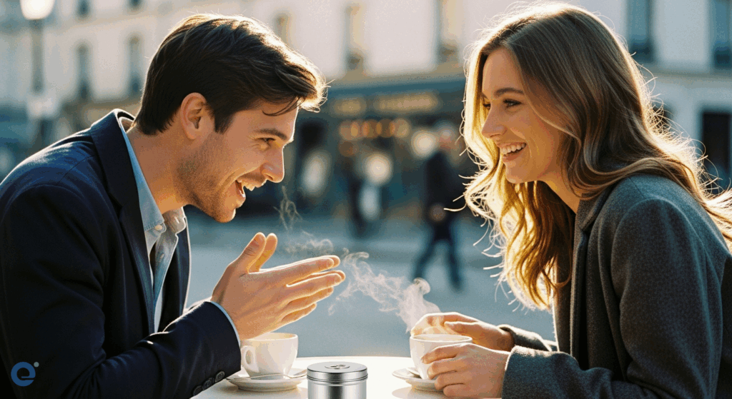 Một cặp đôi trẻ đang trò chuyện vui vẻ, một người đang cất giữ bao cao su một cách cẩn thận trong một hộp đựng kín đáo.