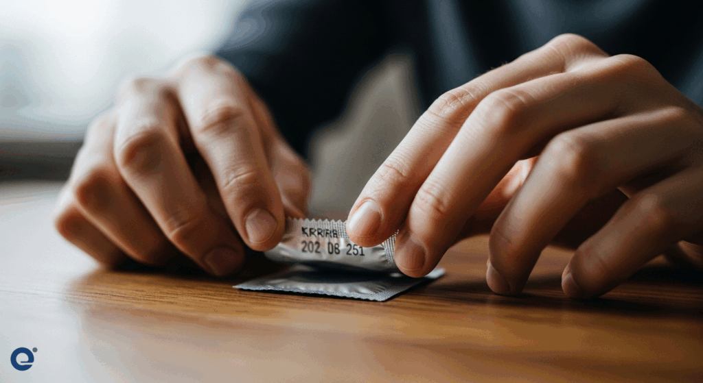Một người trẻ tuổi đang cẩn thận kiểm tra hạn sử dụng trên một hộp bao cao su nhỏ gọn, đặt trên nền bàn gỗ ấm áp, ánh sáng dịu nhẹ chiếu vào.