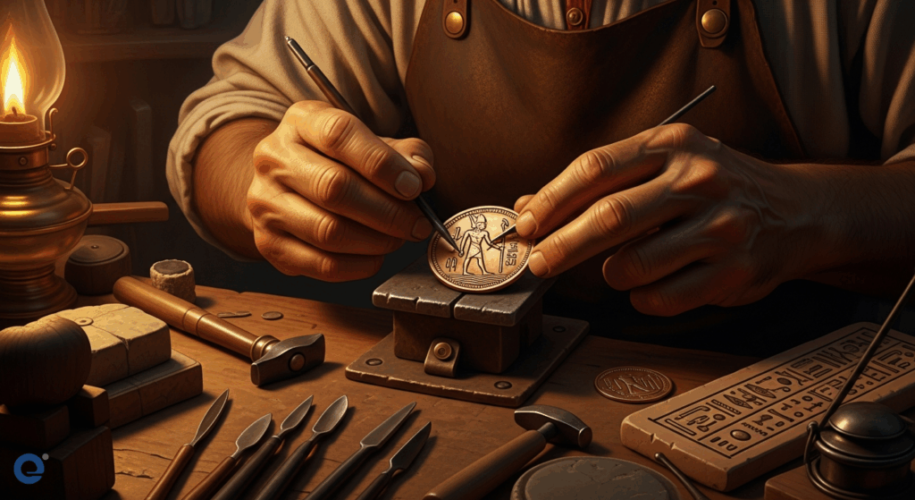 Một người thợ kim hoàn cổ đại đang tỉ mỉ khắc họa hình ảnh thần sông Nile lên một đồng xu bằng đồng. Ánh sáng từ ngọn đèn dầu chiếu rọi lên bàn làm việc, làm nổi bật các dụng cụ và phôi đồng lấp lánh.