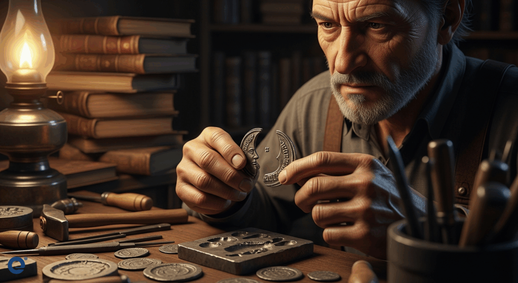 Một người thợ đúc tiền cổ đang cẩn thận kiểm tra một đồng tiền có hình lưỡi liềm bị lỗi, ánh mắt tập trung cao độ.