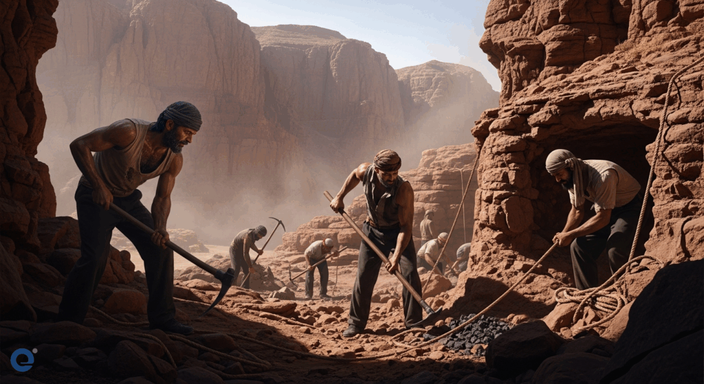 Hình ảnh tái hiện cảnh khai thác đồng cổ đại tại Timna, với những người lao động vất vả dưới cái nắng gay gắt của sa mạc.