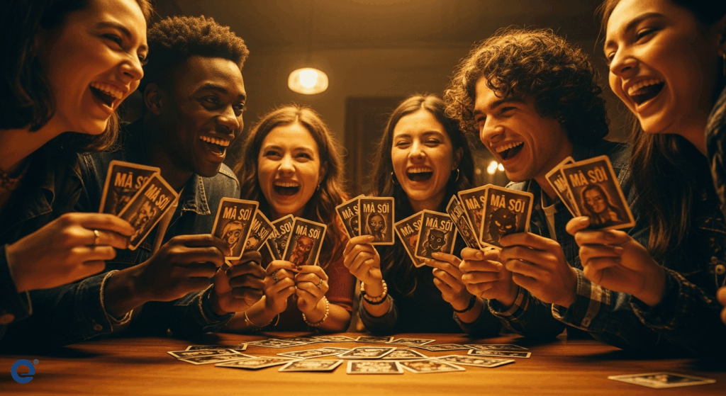 Một nhóm bạn trẻ Gen Z đang cười đùa, tay cầm thẻ bài Ma Sói, chuẩn bị cho một ván đấu đầy kịch tính.