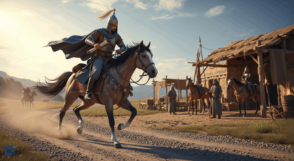 Một người đưa tin Sasanian mặc trang phục truyền thống, đang phi nước đại trên một con ngựa mạnh mẽ, mang theo cuộn giấy, trên con đường trải sỏi dẫn đến một trạm dừng chân có người chờ sẵn với những con ngựa khác.