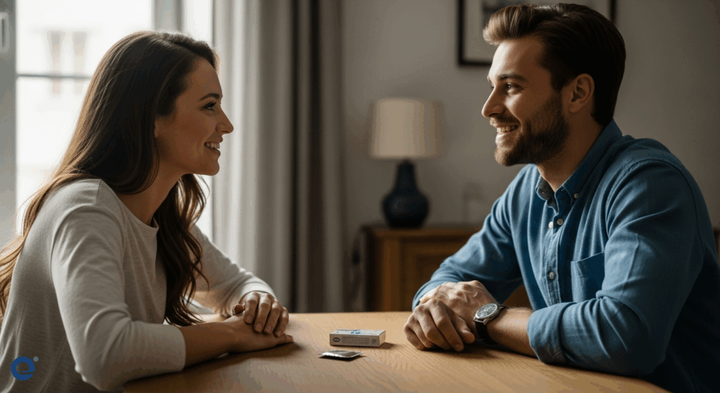 Một cặp đôi trẻ đang trò chuyện vui vẻ và cởi mở, với một hộp bao cao su đặt tinh tế trên bàn, thể hiện sự thoải mái và tin tưởng lẫn nhau trong không gian riêng tư.