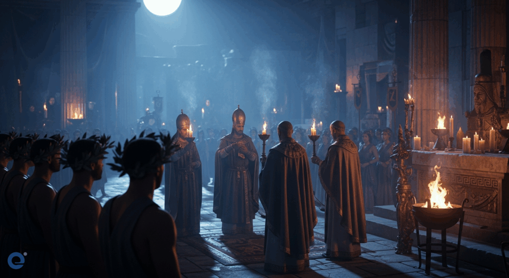 Lễ Tế Olympia, một nghi thức cổ xưa, thường diễn ra trong không khí trang nghiêm và linh thiêng. Dưới ánh trăng huyền hoặc, các vận động viên, những người mang trong mình khát vọng chiến thắng, cùng các tư tế, những người kết nối với thần linh, và đông đảo khán giả, tất cả đều tham gia vào buổi lễ. Họ cầu mong sự phù hộ, ban phước lành cho mùa màng, cho những cuộc thi sắp tới, và cho sự bình an của thành bang.