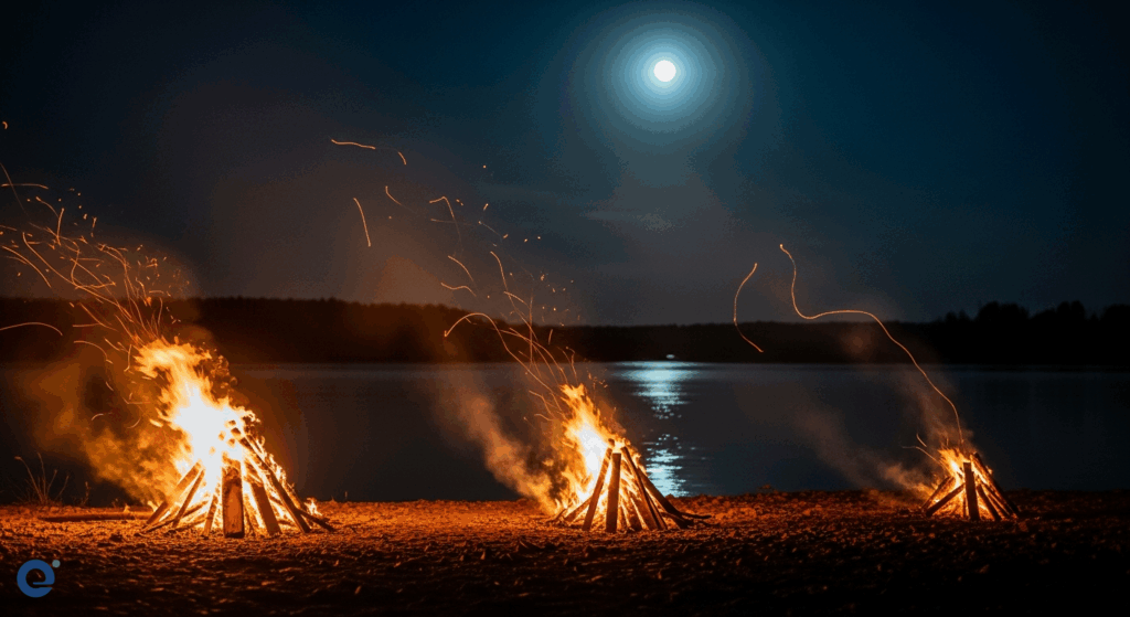 Hình ảnh “ban đêm nhóm bếp ở ba bờ” gợi lên một khung cảnh đầy ẩn ý. Mỗi bờ bếp lại mang một đặc tính riêng: “bờ ấm cho soi rõ”, “bờ lạnh cho lẩn mờ”, và “bờ than cho nhiễu nhẹ”. Điều này phản ánh rõ nét các vai trò và tình huống trong một ván Ma Sói. Khi lửa cháy sáng ở “bờ ấm”, mọi thứ dường như trở nên rõ ràng, dễ đoán. Đây có thể là lúc dân làng có những manh mối rõ ràng, hoặc khi một nhân vật quan trọng lộ diện.