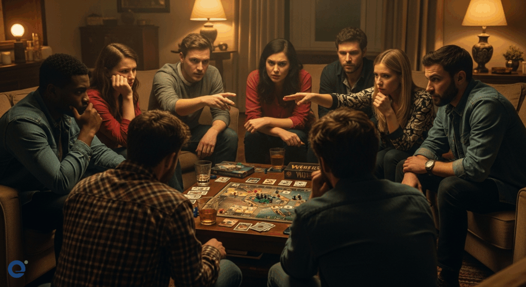 Một nhóm người chơi Ma Sói đang thảo luận sôi nổi, với biểu cảm căng thẳng và nghi ngờ trên khuôn mặt, ánh mắt dò xét lẫn nhau trong không gian phòng khách ấm cúng.