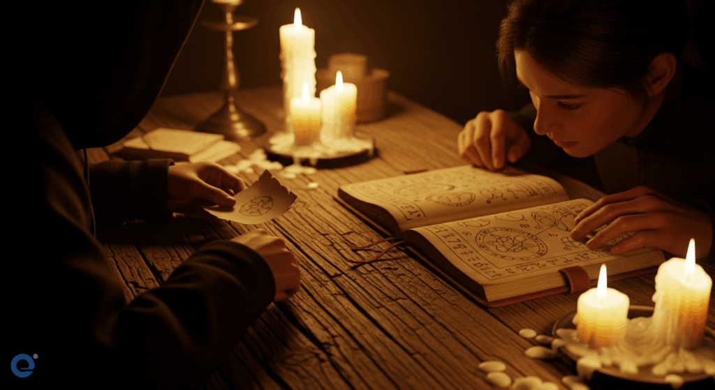 Trong ánh nến mờ ảo, hai người chơi ngồi đối diện nhau, một người đang bí mật trao đổi một mảnh giấy nhỏ, trong khi người kia đang chăm chú nhìn vào bảng ghi chép, cố gắng giải mã những ký hiệu bí ẩn.