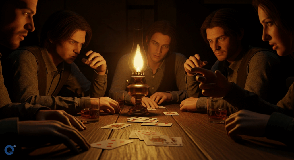 Trong một căn phòng với ánh sáng mờ ảo, sáu người chơi ngồi quanh bàn, ánh mắt căng thẳng nhìn nhau, tay đặt sẵn trên bàn, sẵn sàng cho lượt thảo luận nhanh trong ván Ma Sói siêu tốc.