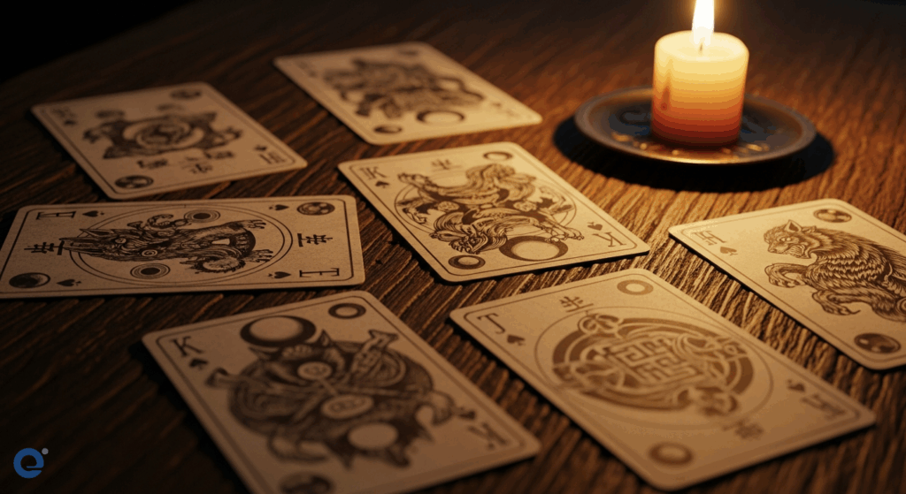 Những quân bài Ma Sói cổ xưa, với hình ảnh gợi nhớ đến những nghi lễ bí ẩn thời nhà Thương, được đặt trên bàn gỗ sẫm màu, ánh nến lung linh chiếu rọi.