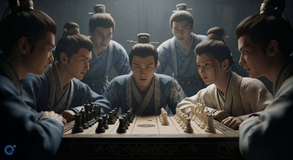 Một nhóm người mặc trang phục cổ trang, ngồi quanh một bàn cờ bí ẩn, ánh mắt dò xét nhau trong không khí căng thẳng.