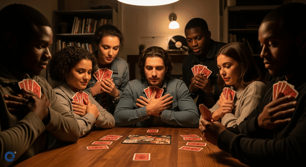 Một nhóm bạn trẻ đang tụ họp quanh bàn chơi Ma Sói, ánh mắt đầy tập trung và những nụ cười bí ẩn.