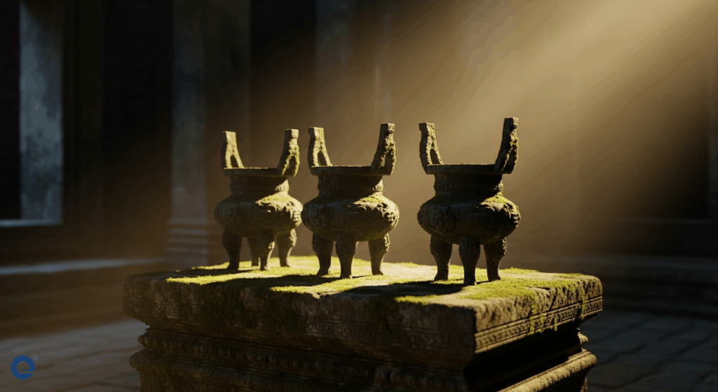Ba chiếc đỉnh đồng cổ kính, bề mặt phủ lớp rêu phong thời gian, đặt trang trọng trên bệ đá trong không gian tĩnh mịch của một ngôi đền cổ, ánh sáng vàng dịu hắt lên từ phía sau.