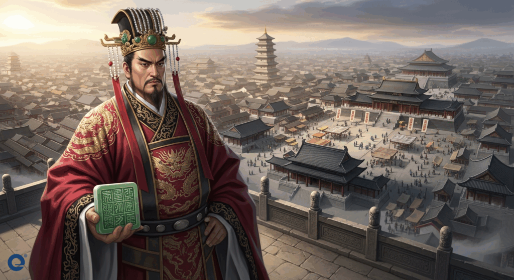 Một vị vua nhà Chu uy nghiêm, tay cầm ấn ngọc bích hình vuông với những ký tự cổ khắc trên mặt, đứng trên bệ đá cao, nhìn ra toàn cảnh kinh thành.