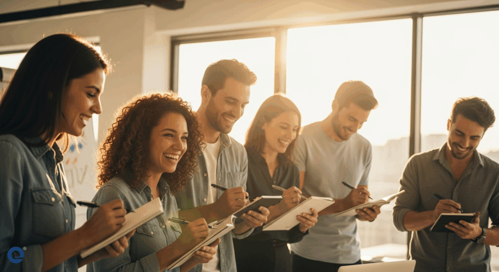 Một nhóm nhân viên trẻ tuổi, năng động đang hào hứng tham gia một buổi workshop tương tác, tay cầm bút và sổ, môi cười rạng rỡ.