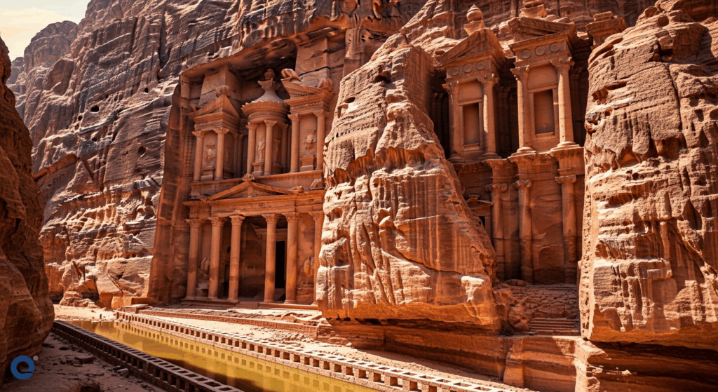 Petra nổi tiếng với các công trình kiến trúc được tạc trực tiếp vào đá. Nổi bật nhất là Al-Khazneh, hay còn gọi là “Kho Báu”. Công trình này, với mặt tiền được chạm khắc tinh xảo, là sự kết hợp tuyệt vời giữa phong cách Nabataean và Hy Lạp cổ đại. Nó được cho là một lăng mộ hoàng gia.