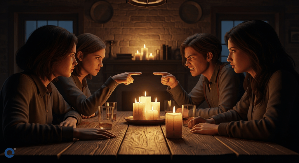 Một nhóm người đang ngồi quanh bàn, ánh nến lung linh chiếu rọi khuôn mặt căng thẳng của họ. Một người đang chỉ tay vào một người khác, trong khi những người còn lại lắng nghe với vẻ dò xét.