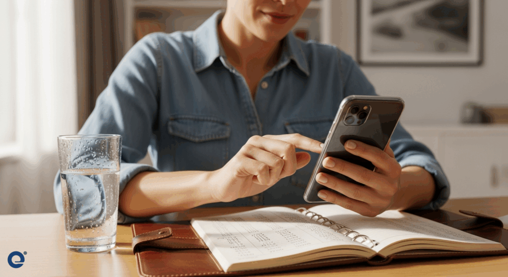 Một người phụ nữ đang tỉ mỉ kiểm tra các chỉ số sức khỏe trên màn hình điện thoại, bên cạnh là ly nước lọc và một cuốn sổ ghi chép tài chính.